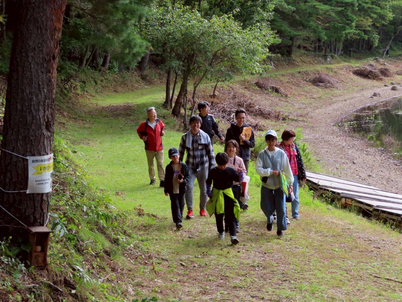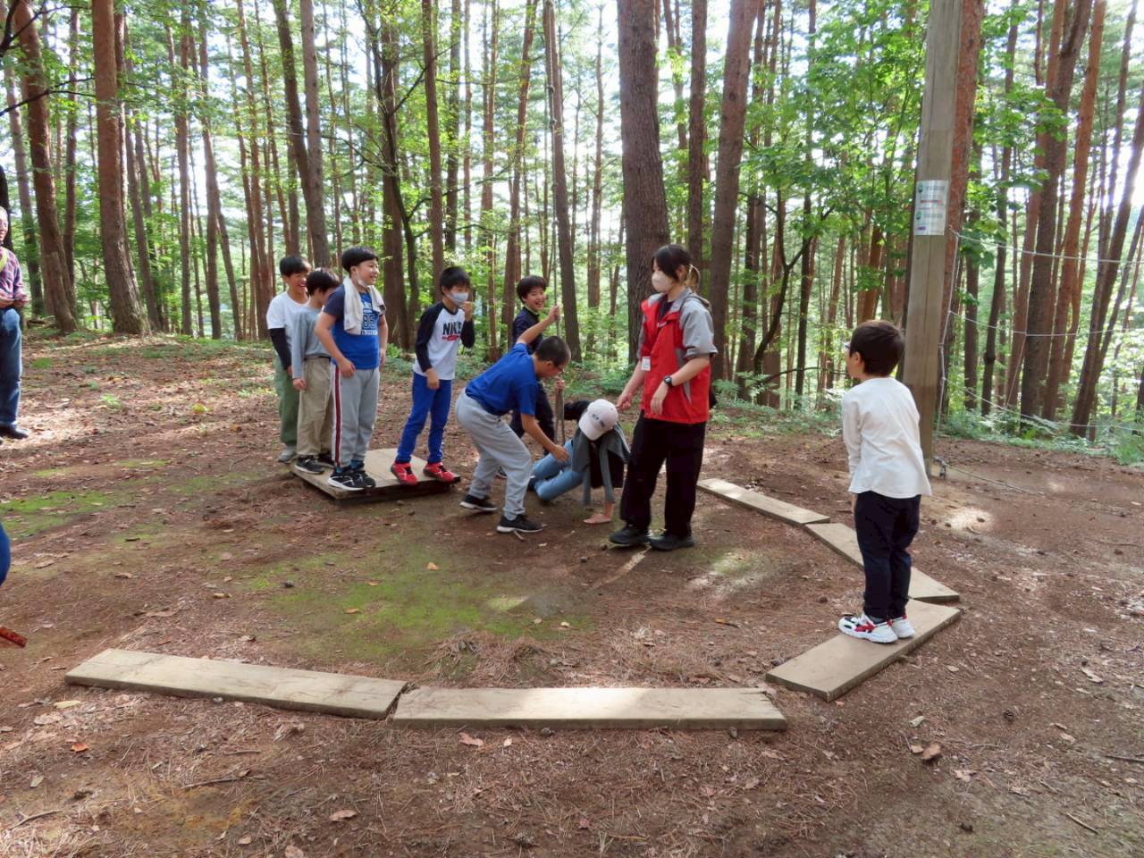 2日目は、朝の「ラジオ体操」から始まり、朝食、部屋掃除をしてから「追跡ハイキング」を行いました。天気にも恵まれ、沼の近くまで行ったり急な山を登ったりと、目印やクイズの標識を頼りにかなり長い距離を歩きました。途中、山の頂上にある「眺望の砦」からは遠くの景色まで見ることができたり、「野外ステージ」を発見したりと、参加者全員でとてもいい野外体験をすることができました。